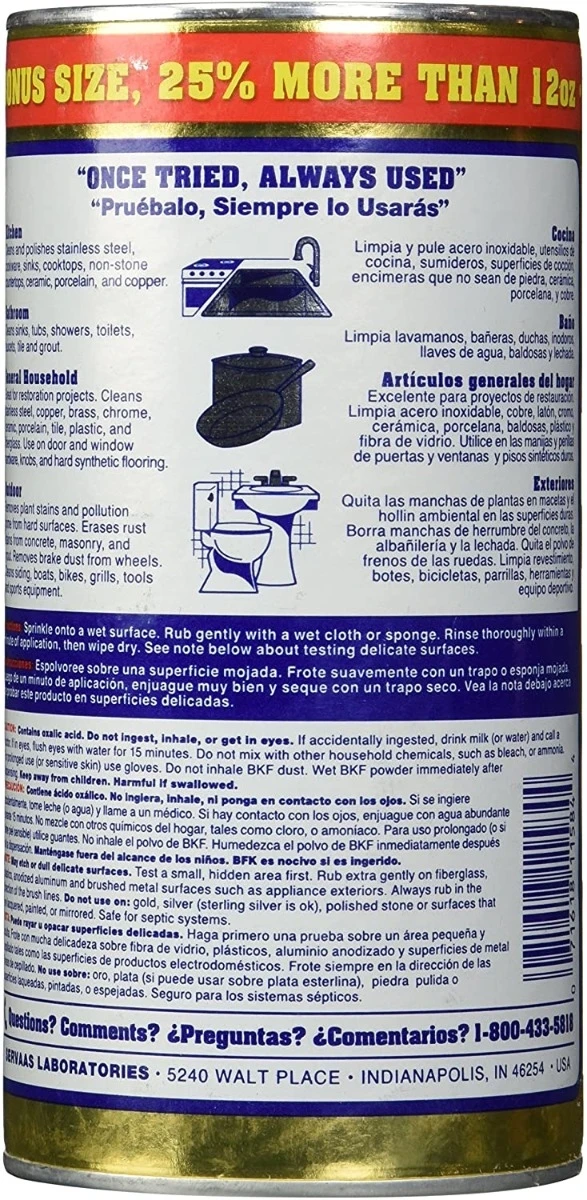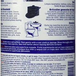 This non-abrasive powder removes rust and hard water stains. Cleans copper, tile, brass, stainless steel, marble, porcelain, plastics and glass cooktops.