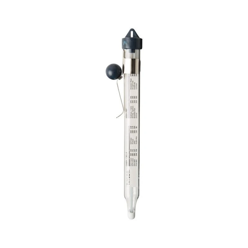 Craving a sweet treat? Use this classic glass tube candy thermometer to help monitor temperatures for the perfect consistency. Thermometer is sold with an adjustable pan clip that fits any pan. Important temperatures for candy making and deep fry temperatures are printed right on thermometer insert.