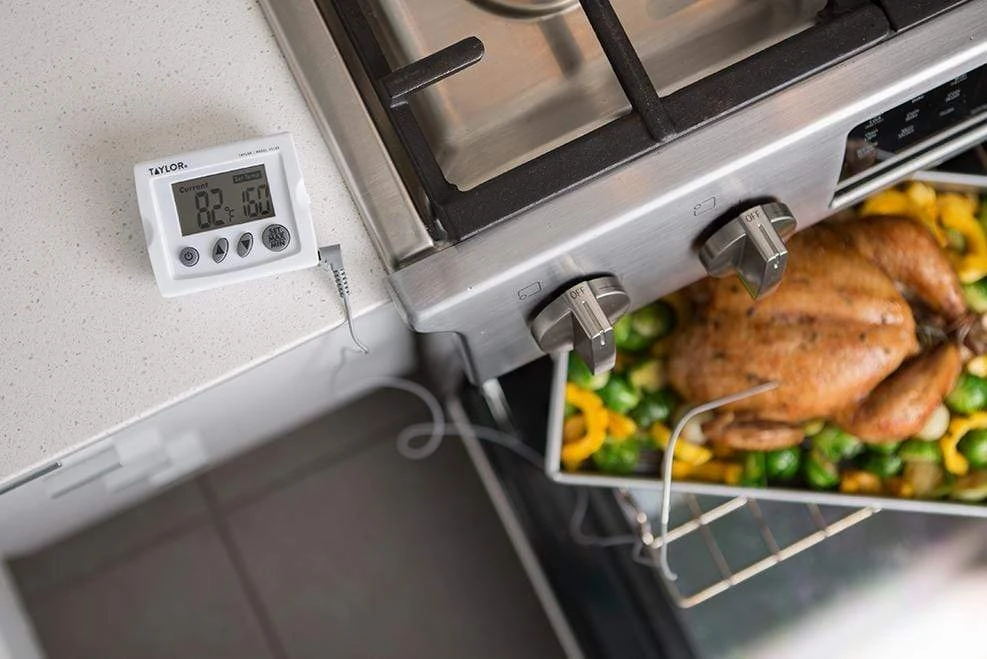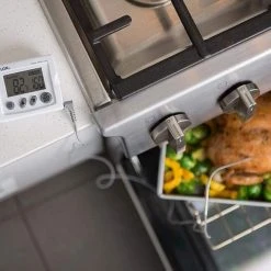 Scared of overcooking the meat? Use this programmable Digital Wired Probe Thermometer to set the ideal temperature and wait for the audible alert to signal the desired temperature is reached. The stainless probe is left in the meat during cooking and the wire snakes out of the oven door or grill lid to the countertop base station. Displays temperatures in either Fahrenheit or Celsius.