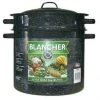 Enjoy your favorite fruits and vegetables throughout the year. This canner includes a 21.5 qt. canner with side handles, a lid and jar rack. This durable porcelain on steel pot heats quickly and efficiently; saving energy. The versatile jar rack holds: 7 – quart jars, 9 – pint jars or 13 – half pint jars and is dishwasher safe.