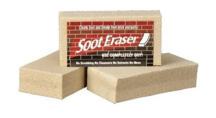 The Soot Eraser works like an eraser, absorbing smoke residue, soot, fly-ash and dirt. Use it completely dry. No scrubbing, no mess, no solvents, no cleanser. Made from a non-toxic 100% natural Vulcanized rubber, the Soot Eraser works on most surfaces including: brick, mantels, fireplace hearths, woodwork, window blinds, window shades, painted walls and most wallpaper.