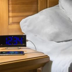 Atomic time with the newest technology; This alarm clock has a blue curved display which offers a larger and easier to read display at all angles. Easy-to-use charging port for your phone while you sleep.