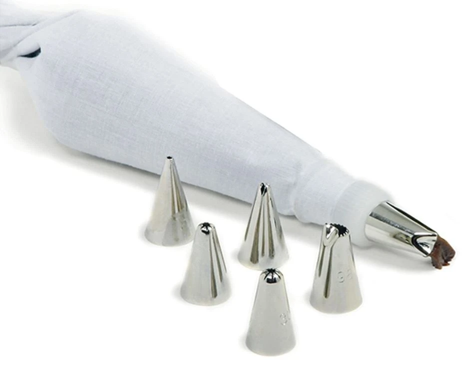 Stainless steel, corrosion resistant, reusable, non-stick, tasteless tips include: #2 Writing Tip, #27 Star Tip, #30 Large Star Tip, #61 Petal Tip, #67 Leaf Tip, and #98 Shell Tip.