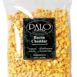Bacon Cheddar Our Bacon Cheddar, the latest addition to the Palo Popcorn lineup, has become one of our most popular sellers and most talked about flavors. Pure coconut oil, non-GMO seed, salt, REAL cheddar cheese, and our unique bacon seasoning. Mmm…Bacon. |