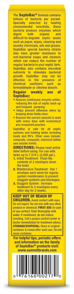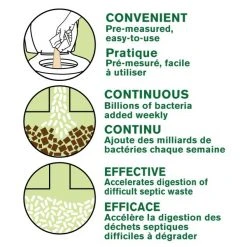 Effective:Ā The bacteria in SeptoBac septic tank treatment are specially selected by leading environmental scientists to be effective under a wide range of waste and septic system conditions. Billions of bacteria in each gram of SeptoBac powder digest both organic and difficult-to-degrade septic waste such as paper, wipes, cleaning and laundry chemicals, oils and grease. SeptoBac also contains microbial nutrients to stimulate and strengthen regular bacteria levels.
