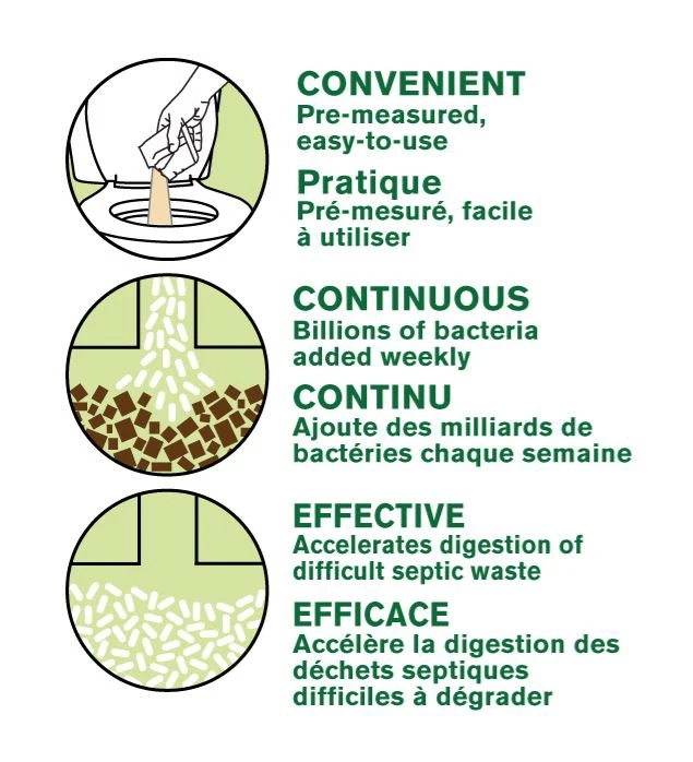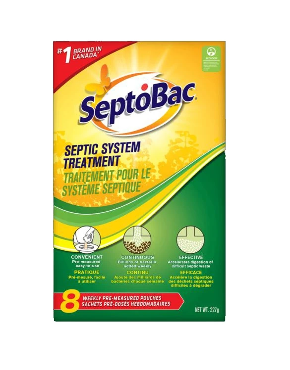 The #1 brand of septic system treatment in Canada*, SeptoBac® offers this ECOLOGO certified, easy-to-use weekly septic tank treatment. Each pouch contains a concentrated formula with billions of specialized enzyme-producing bacteria which digest organic and difficult-to-degrade septic waste. SeptoBac also contains microbial nutrients to stimulate bacterial growth and help maintain a healthy septic system.